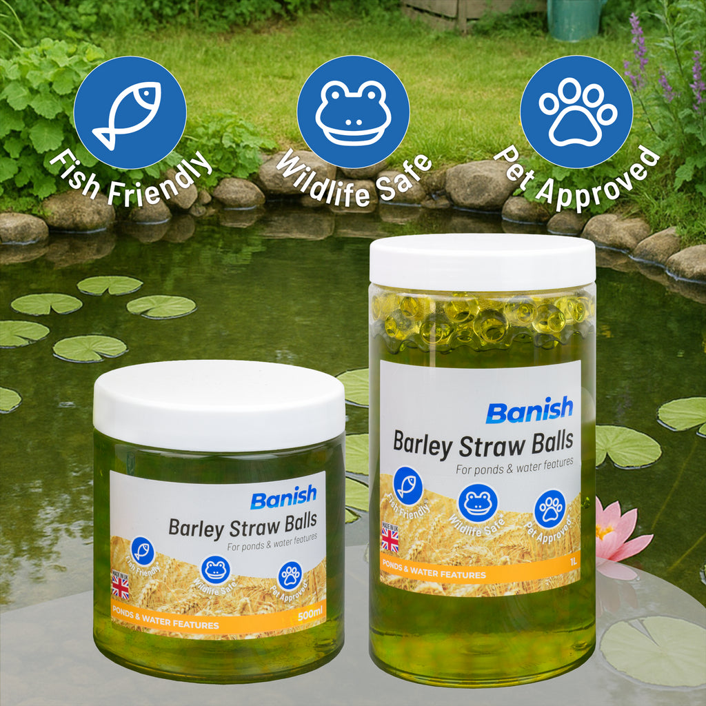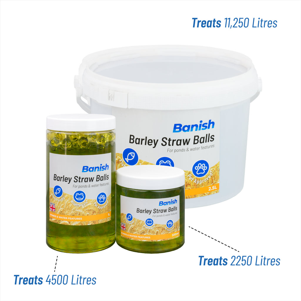 Banish Barley Straw Balls are extremely effective against unsightly green water, duckweed and blanketweed algae. This effective chemical treatment inhibits algae growth at its core, allowing you to quickly achieve a beautiful, algae-free pond. Barley straw extract has a long history of promoting a healthy pond environment. While technically a natural ingredient, the extract produces potent biocides that effectively inhibit algae growth.