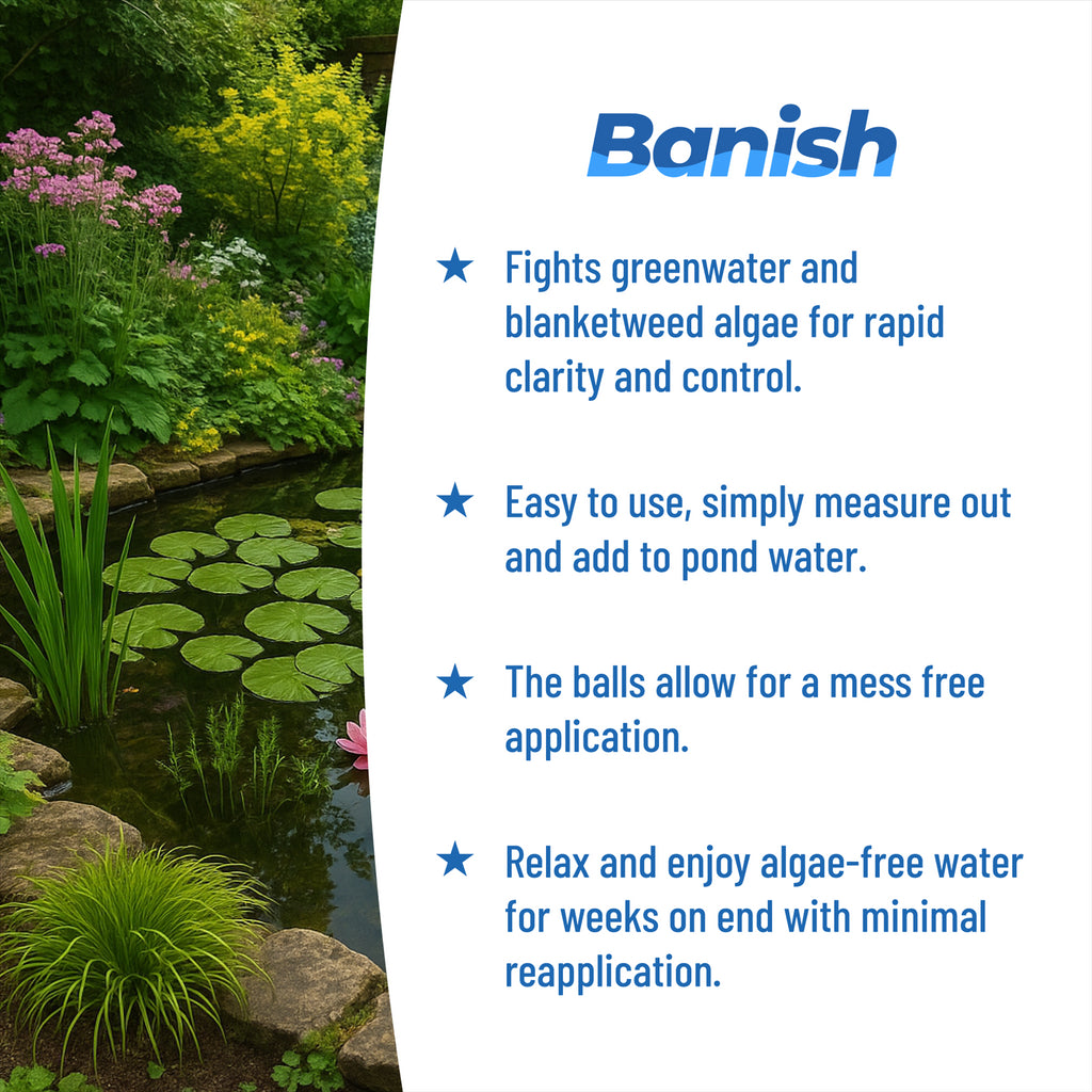 Enjoy the peace of mind that comes with a strong chemical treatment that does the job quickly. Simply follow the dosage instructions and add the Banish Barley Straw Balls directly in your pond. This straightforward method provides long-term algae control, allowing you to spend less time maintaining and more time enjoying your crystal-clear pond.