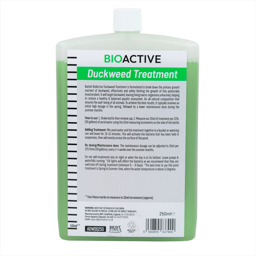 Every pond is prone to algae growth and green water. Banish BioActive Duckweed Treatment is formulated to break down the primary growth nutrient of algae. It will target Duckweed algae while leaving living macro-organisms unharmed, helping to restore a healthy & balanced aquatic ecosystem. With a natural bacteria composition, this treatment is pet and wildlife safe To achieve the best results and ensure clearer pond water, use a high dosage of the pond weed remover in the spring, followed by a lower maintenance dose during the summer months.