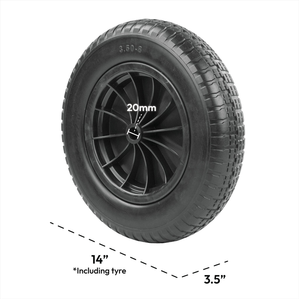 Built for heavy-duty garden work, construction sites, and demanding environments. The robust puncture-proof design ensures long-lasting performance without the need for inflation. Compatible with a wide range of wheelbarrow models, this tyre provides excellent stability and traction on grass, gravel, soil, and uneven ground, making it ideal for transporting compost, soil, bricks, and other heavy materials. Easy to install, this is the perfect hassle-free replacement for your wheelbarrow.