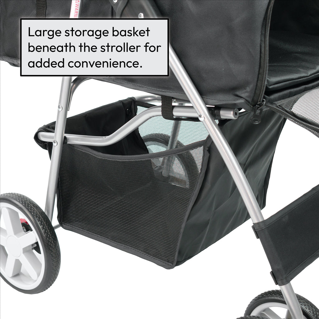 The stroller has a useful storage compartment located at the bottom of the frame as well as zip doors on the compartment for your pet so even the smaller pets can still see outside. There are 2 cupholders and a smaller storage compartment at the top of the stroller as well for your convenience.