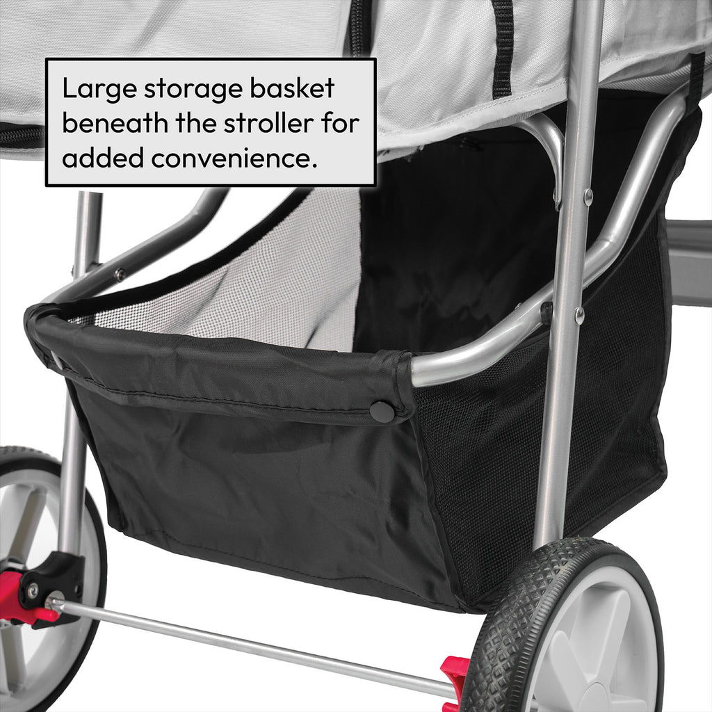 The stroller has a useful storage compartment located at the bottom of the frame as well as zip doors on the compartment for your pet so even the smaller pets can still see outside. There are 2 cupholders and a smaller storage compartment at the top of the stroller as well for your convenience.