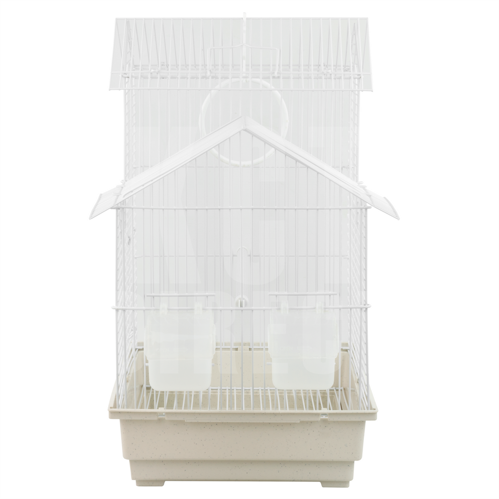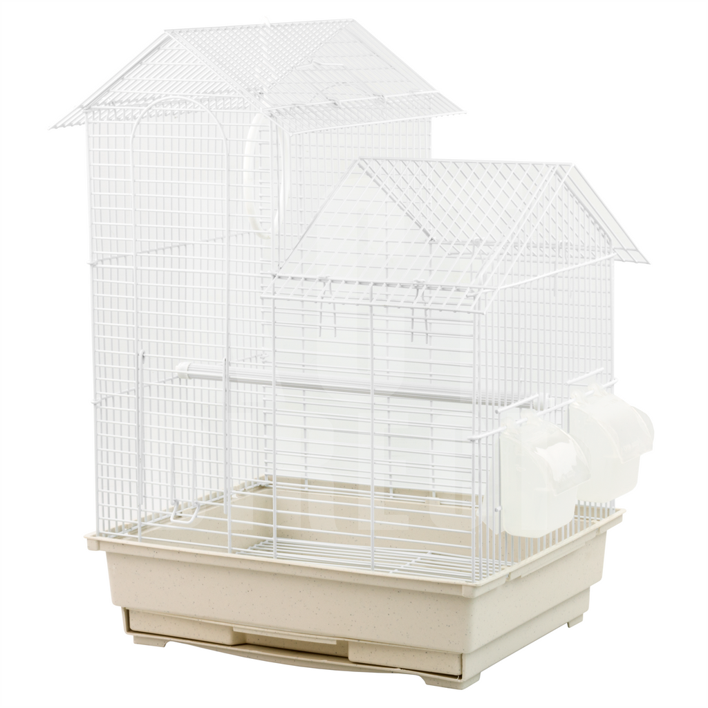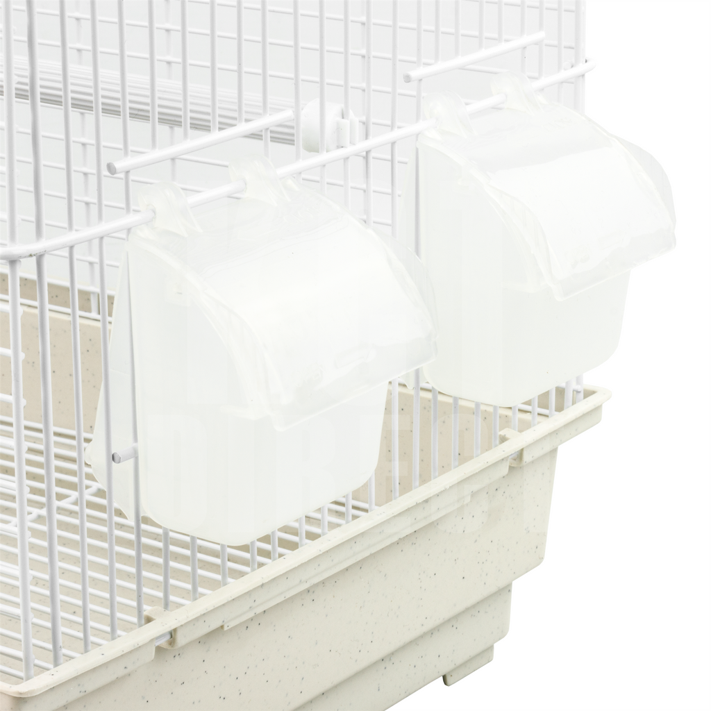 This model comes with two varying roof heights which creates a more interesting space for your bird to fly around. Attachable plastic food cups clip onto the metal exterior with ease so that your pet always has something to eat and drink, the lids also provide some cover for the food cups in order to reduce spillage and foreign objects from entering your pets food and water.